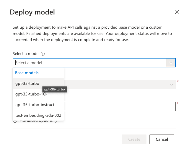 Once you are on the Azure OpenAI page, click the “Create” button on the top left of the dashboard. This is a Azure resource that could host multiple different OpenAI models.