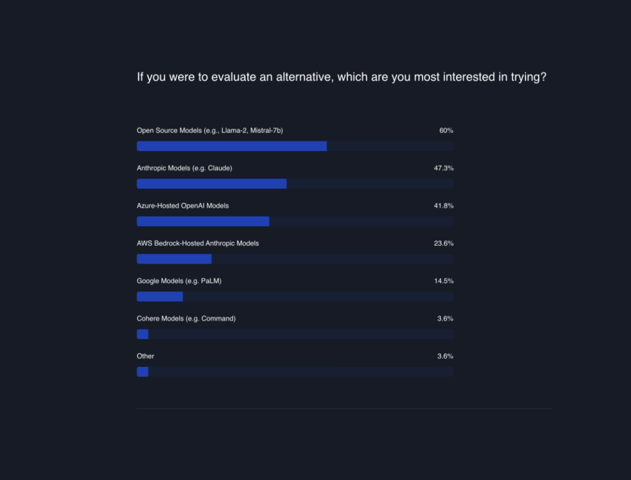 Open Source Solutions (60%) : The majority of respondents showed interest in exploring open source AI solutions. Likely due to enhanced security and flexible hosting infrastructure. Also due to cost effectiveness for high usage and for fine-tuned models as we showed in our recent experiment where we reduced cost of a fine-tuned model by >90% by dynamically swapping LoRA weights. Anthropic Models (47.3%) : Many users are looking at LLM solutions from Anthropic, which is emerging as a runner-up in the AI race. During the period of leadership transition at OpenAI, Anthropic capitalized on the opportunity and launched their new Claude 2.1 model , which features function calling capabilities, a feature previously unique to OpenAI models. Major news outlets also reported that more than 100 OpenAI customers reached out to Anthropic. Azure-Hosted OpenAI Models (41.8%) : A significant portion of users are interested in using Azure hosted OpenAI models possibly due to security, latency, and reliability. People may prefer Azure over OpenAI for reasons like data security and compliance requirements. Azure offers private access and more control over data, aligning with specific industry regulations, and provides customization and integration capabilities essential for business operations. AWS Bedrock-Hosted Anthropic models(23.6%): A notable 23.6% of survey respondents are interested in Anthropic models hosted on AWS Bedrock. This preference suggests that users are looking for AI solutions that combine Anthropic's advanced modeling capabilities with the robust, scalable infrastructure provided by AWS Bedrock.
