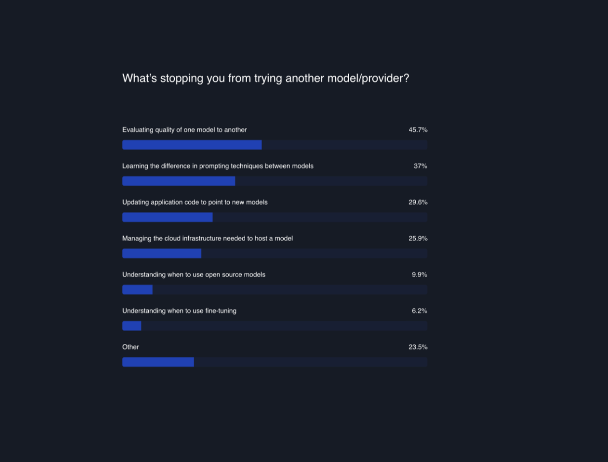 Evaluating Model Quality (45.7%) : The primary challenge is assessing the quality of one model against another. Users must determine whether an alternative model meets or exceeds the performance and reliability of OpenAI's offerings for their use-case. Learning Different Prompting Techniques (37%): A major hurdle is mastering the differences in prompting techniques between various models, which can be significantly distinct and require new learning. If you have LLM features in production, updating your whole chain can be unpredictable, and you might need better infra at solving those changes in production. Updating Application Code for New Models(29.6%): The third major challenge involves updating existing application code to be compatible with new models. If you have complex LLM chains in your app, then this involves chaning your whole infra and prompts; which is indeed challenging. Managing the cloud infrastructure needed to host a model (25.9%): The fourth barrier involves the complexities of managing the cloud infrastructure necessary to host an open-source, Azure hosted OpenAI model, or AWS hosted Anthropic model, a task that can be resource-intensive and requires technical expertise.
