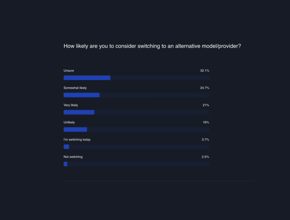 Unsure (32.1%) : A significant portion of users are undecided about switching. This uncertainty could reflect the rapidly changing AI landscape and the need for more information or time to evaluate alternatives. Somewhat Likely (24.7%) : Over a fifth of the users are considering the possibility of switching, indicating they are keeping an eye on other options but are not fully committed to making a change yet. Very Likely (21%) : A notable group of users are strongly considering alternative options, suggesting they see potential benefits in exploring other AI services. Unlikely (16%) : A smaller segment of users feel unlikely to switch. They may be satisfied with OpenAI's services or find the process of switching too cumbersome. Switching Today (3.7%) : A very small fraction are in the process of switching, indicating immediate dissatisfaction or a strong preference for another provider. Not Switching (2.5%) : Small subset of OpenAI users are definitive about not switching, showing strong loyalty to OpenAI.
