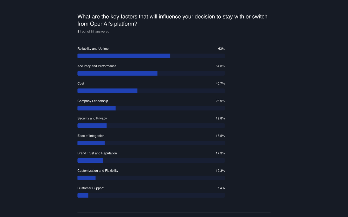 Survey respondents chose their three most important factors for either continuing to use or moving away from OpenAI. The most commonly selected factors were: