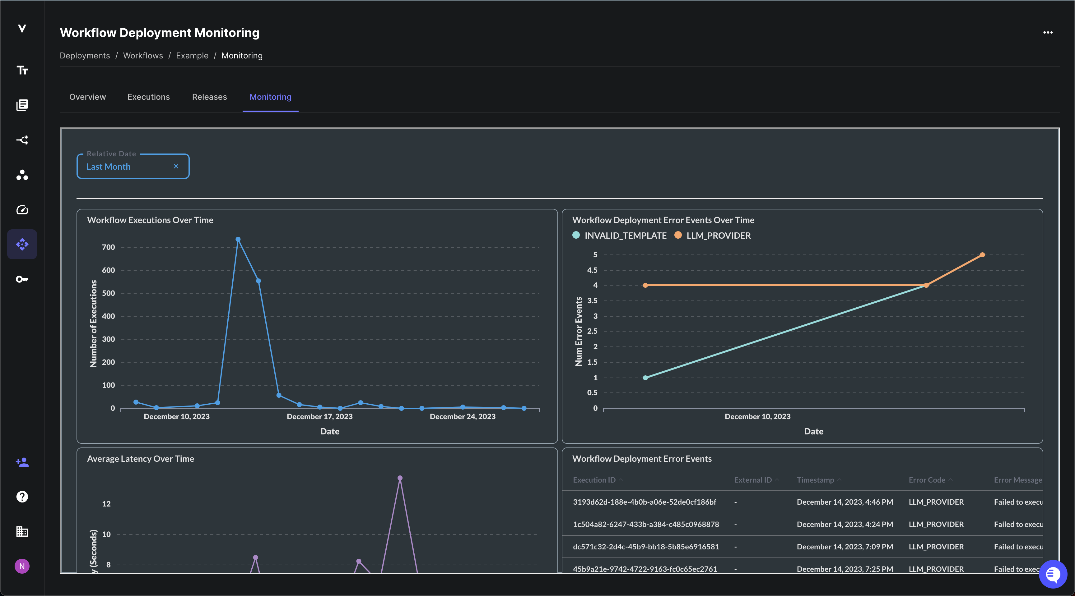 You’ll now see a new “Monitoring” tab in Workflow Deployments which includes charts for visualizing data such as the number of requests, average latency, errors, and more.