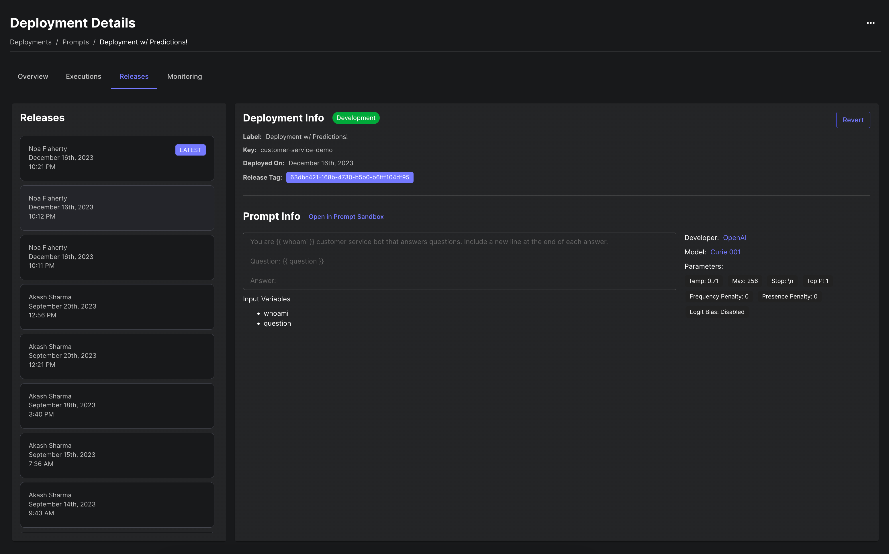 To further improve the process of releasing new versions of Prompts/Workflows, we also now display a warning if you’re about to change the input/output interface of the deployment that’s being updated.