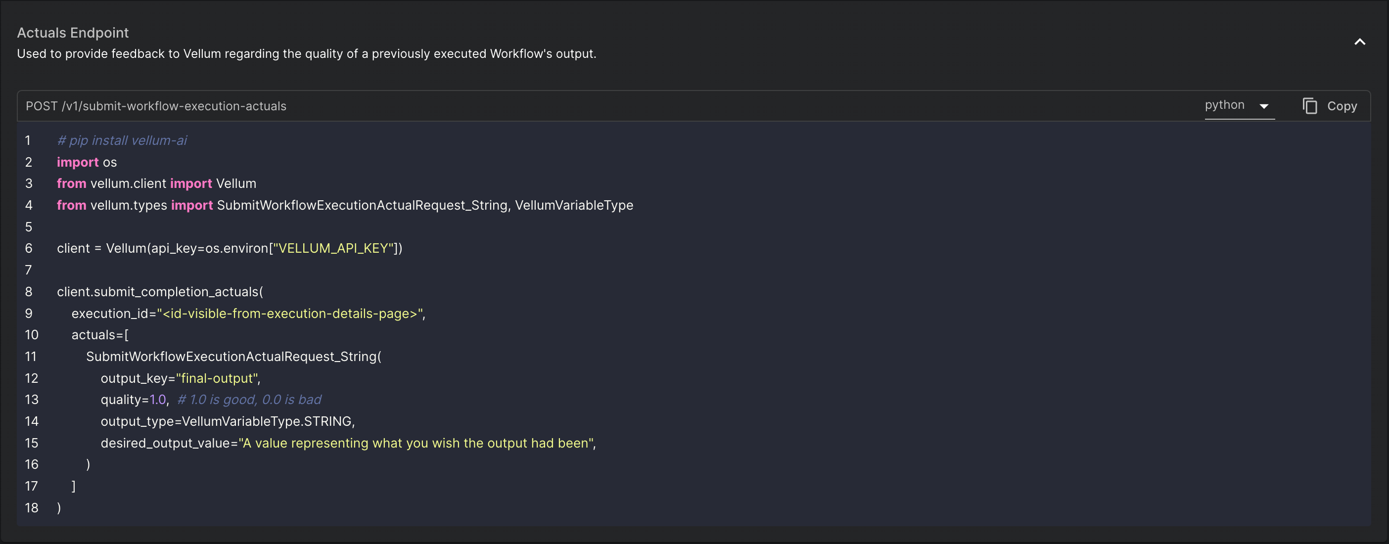 Just like you can “supply actuals” to a Prompt Deployment to capture end-user feedback, you can now do the same for Workflow Deployments. You’re able to supply a quality score (between 0.0 - 1.0) for each Output within the Workflow, as well as a “Desired Output” representing what you wish the output had been.
