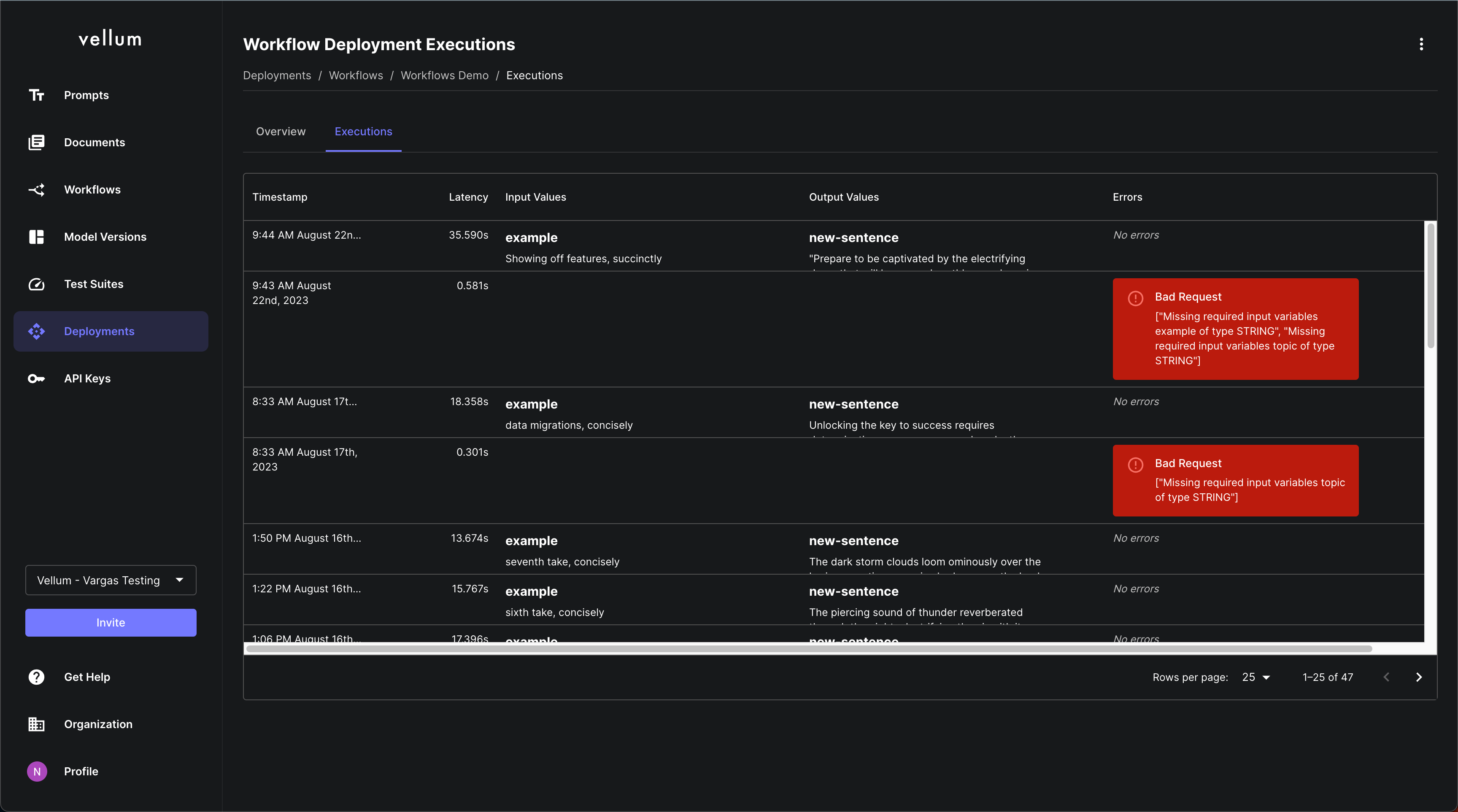 You can now see when errors occur in production on individual Workflow Deployment Executions, as well as a description of the error.