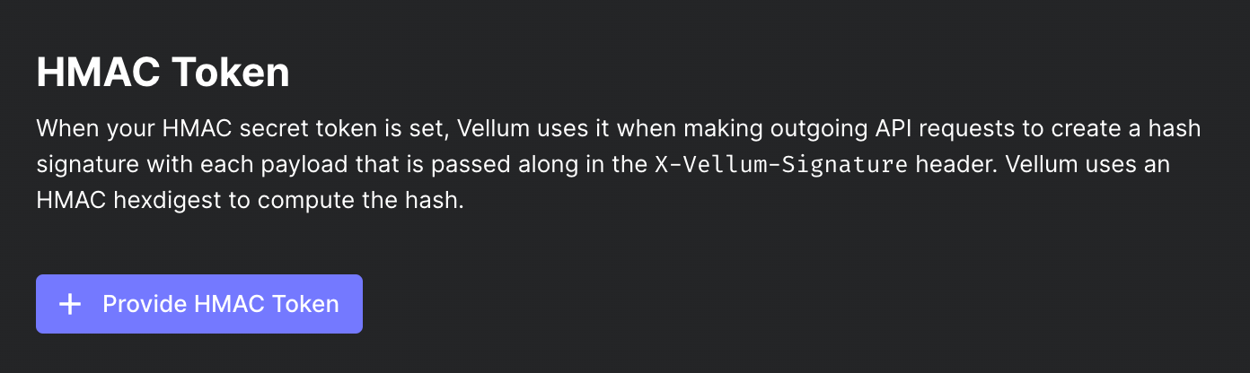 You can now provide a secret token that can be used to verify that outgoing API requests are in fact coming from Vellum. This is especially helpful if you’re standing up endpoints for use by API Nodes or Webhook Evaluation Metrics and want to ensure no one is trying to maliciously impersonate Vellum.