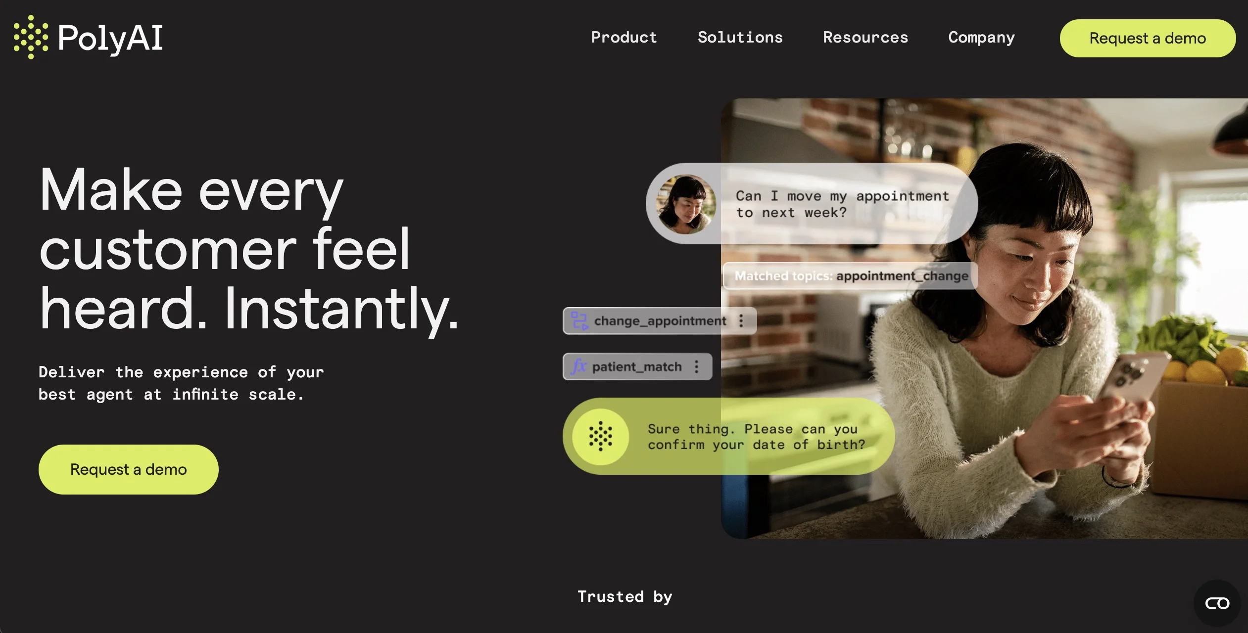 PolyAI: Best for large enterprises that require multilingual, high containment voice assistants that plug directly into existing contact center infrastructures.