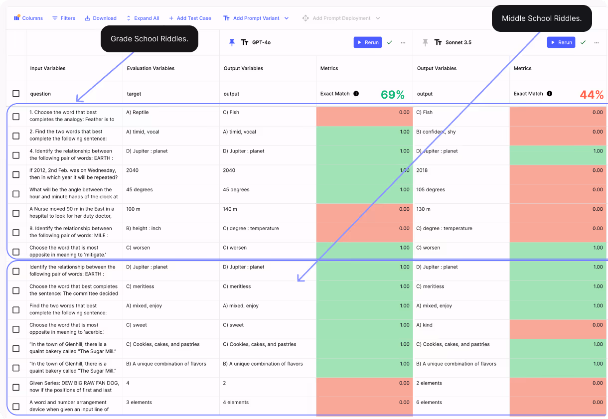 Improvements: We do see that Claude 3.5 Sonnet shows 12 improvements compared to GPT-4o, which signals that more improvements were achieved than regressions. More research & working with the prompt is needed here to eliminate the regressions but maintain these improvements. GPT-4 however had the most improvements when compared to GPT-4o.