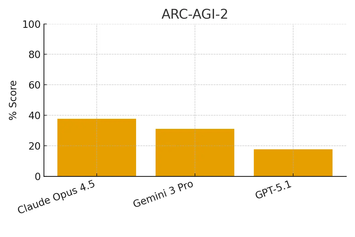 Claude Opus 4.5 shows a significant lead in this abstract reasoning task, more than doubling the performance of GPT-5.1.