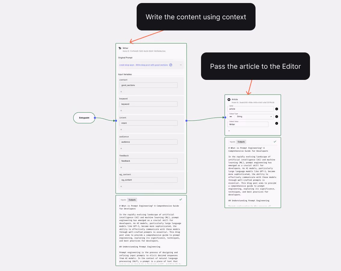 Now let’s look at our “Writer” workflow. This workflow will ingest all of the context that we’ve generated before, like: