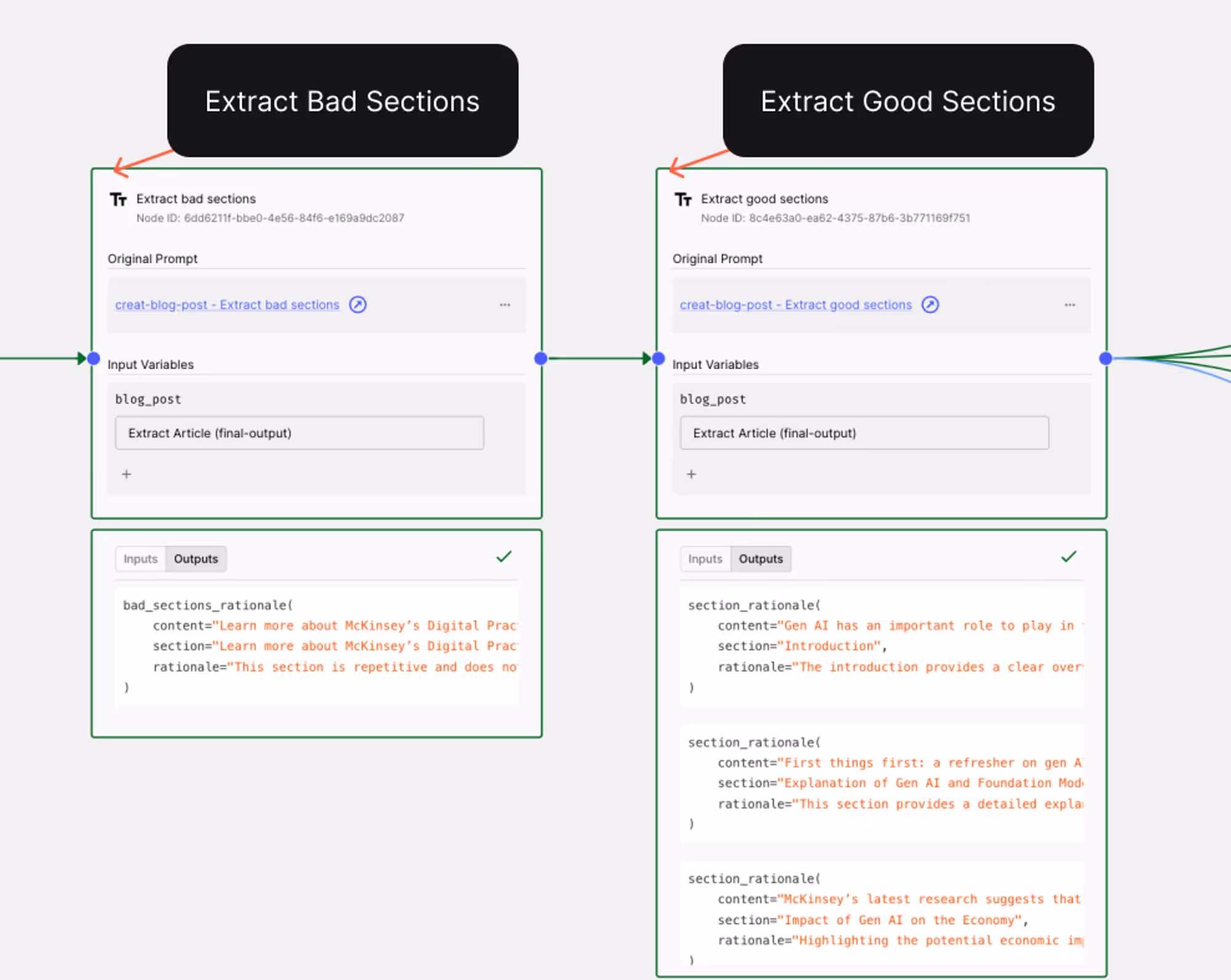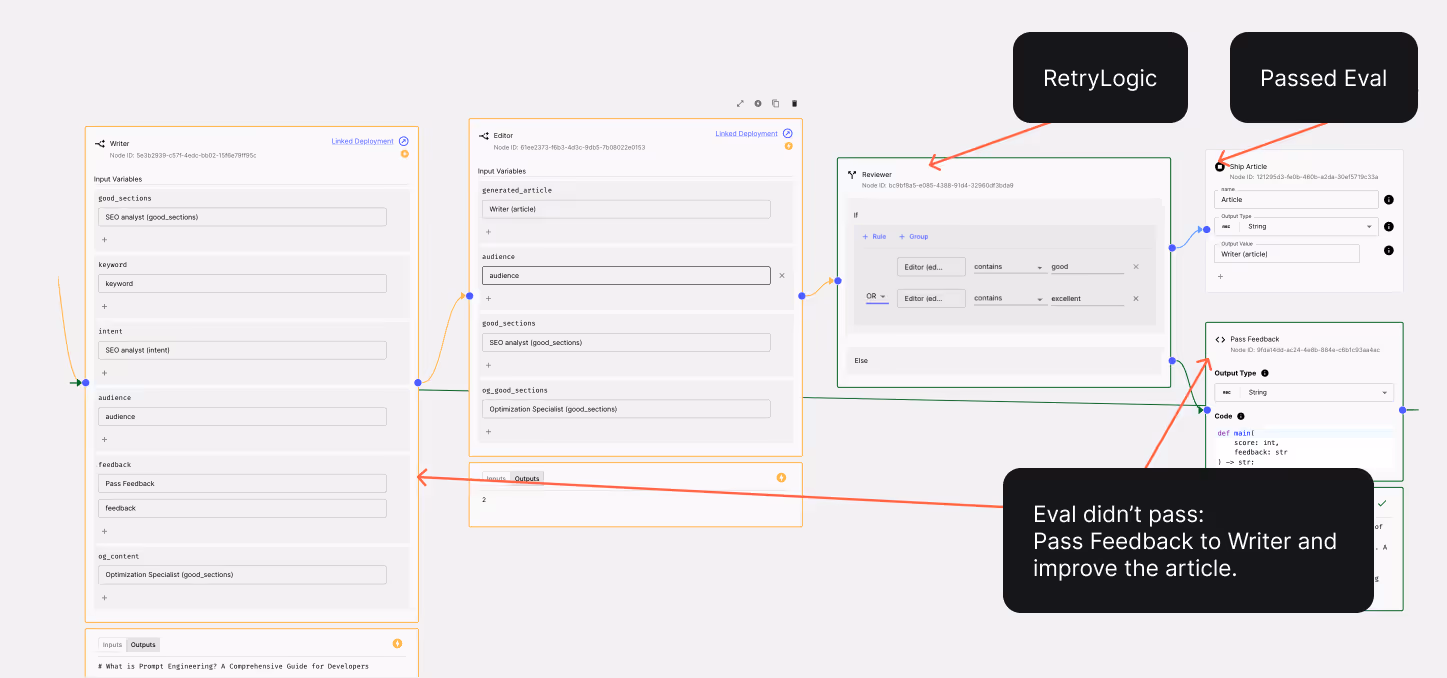 You can find the prompt that we’ve used for this evaluator on this link. Here is how the “Editor” workflow looked like: