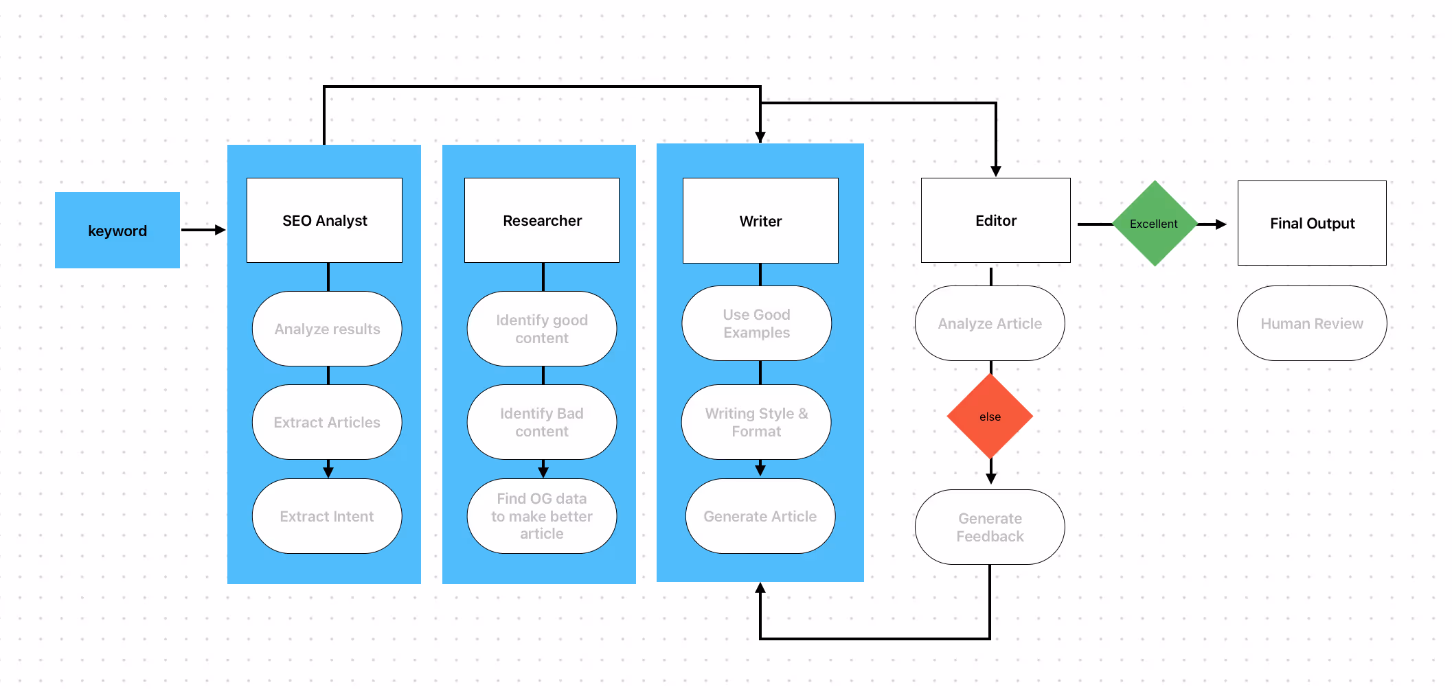 This is just a very simple iteration on how an SEO-driven Content Writing agent should be built. To create better articles we can expose more tools and data sources to all of the roles in our agent workflows, for example: