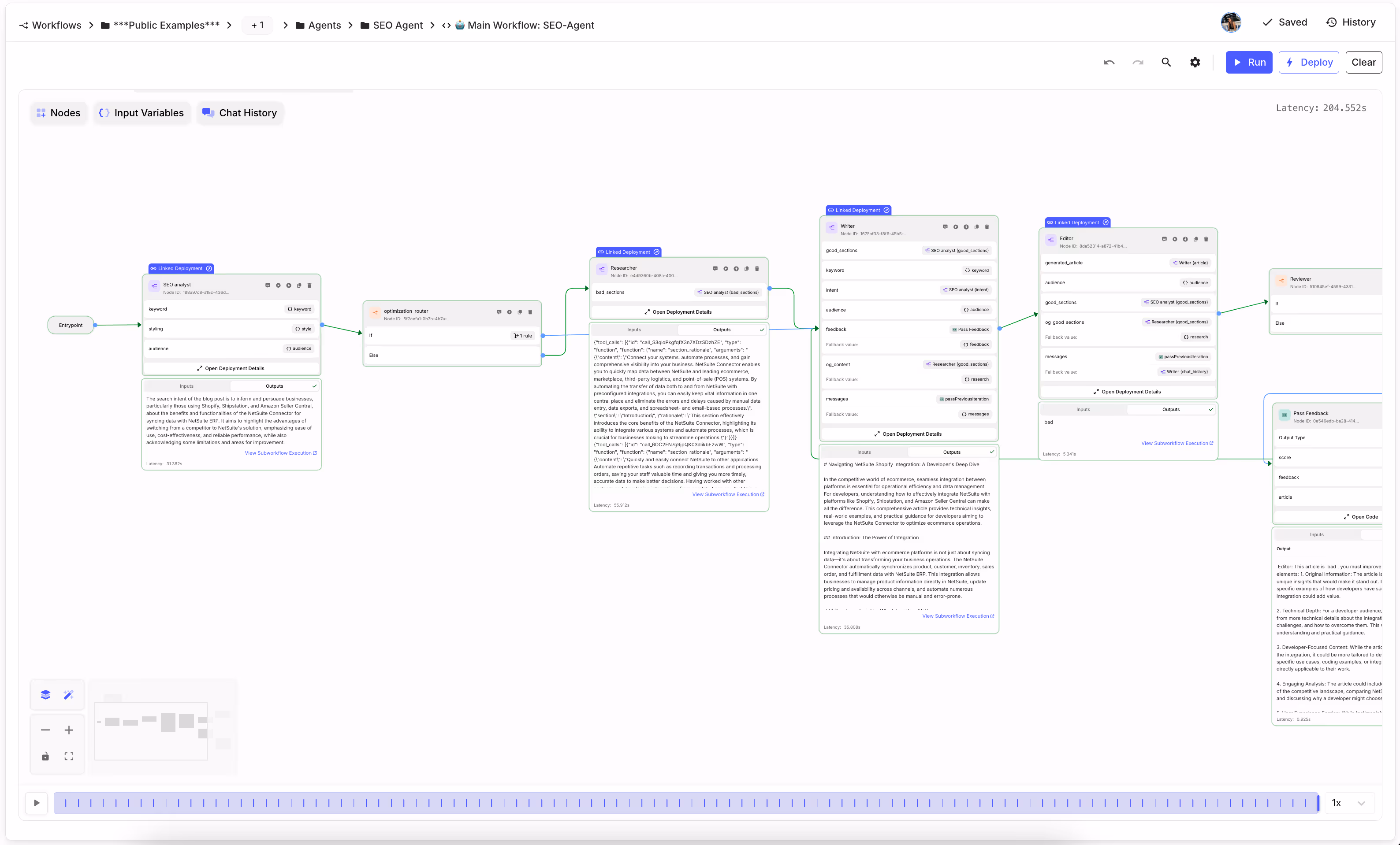 We used Vellum’s Workflow builder to build an SEO agent that has 4 tools (subworkflows) for things like keyword research, content analysis, content generation, and evaluation.