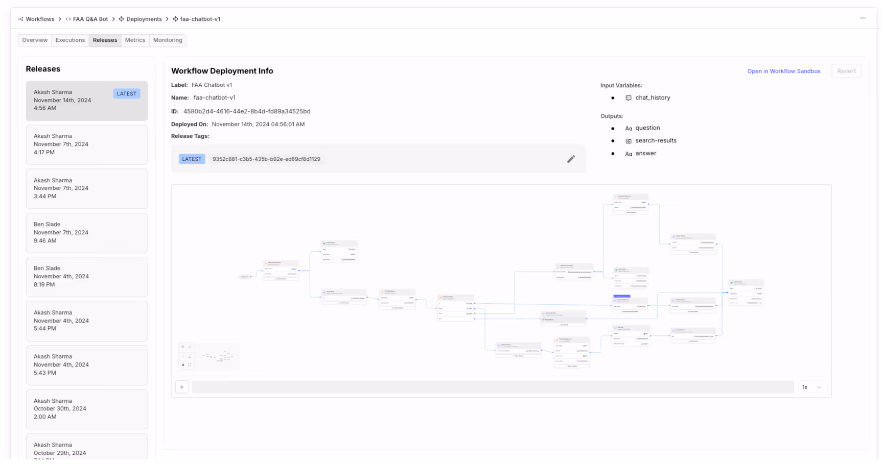 Inspired by software package management systems like PyPI and npm, Vellum lets you cut and tag releases for your SubWorkflows. Each version is tagged so you can pin to a version or automatically use the latest version of your subworkflow (tool).