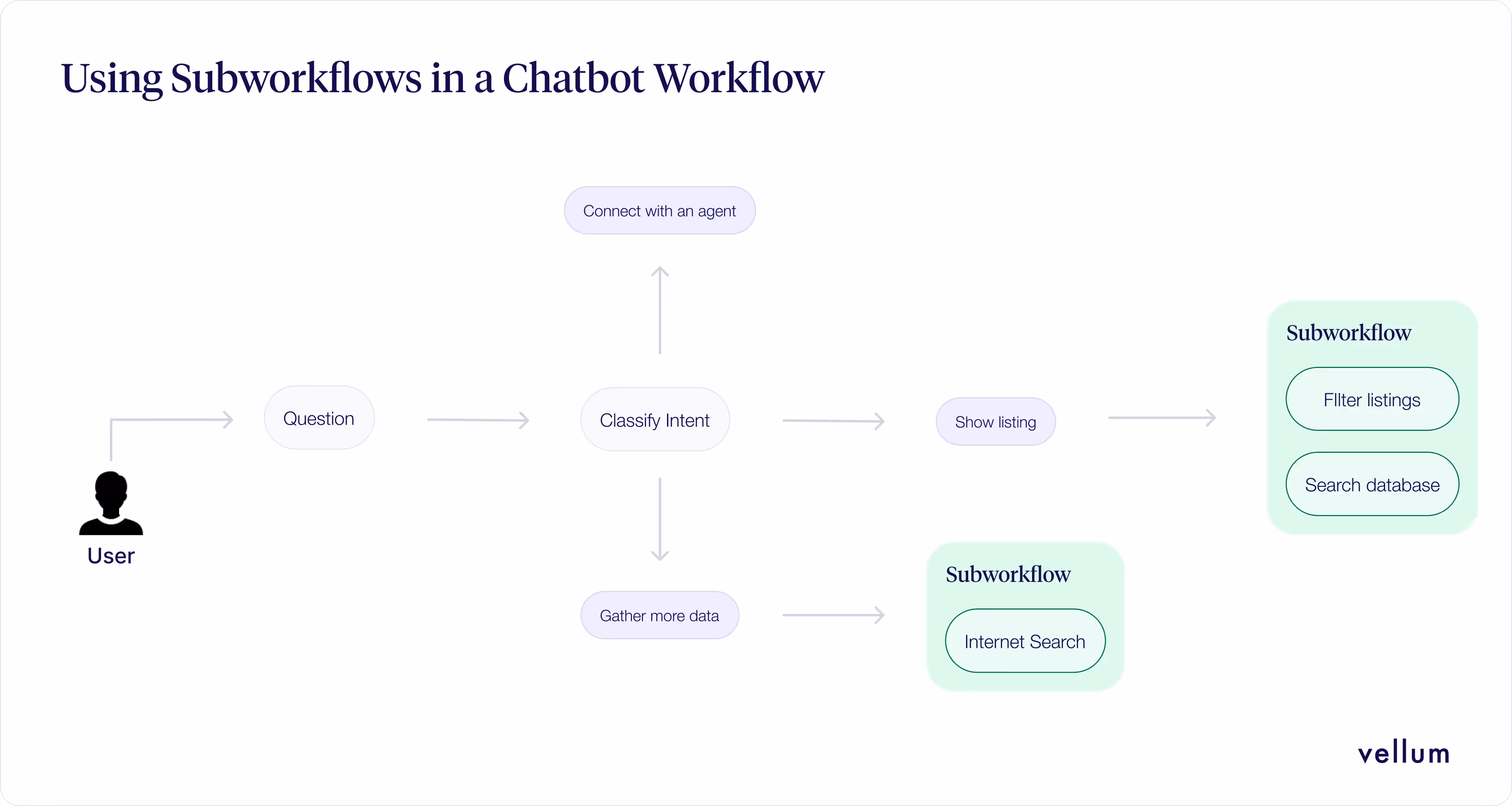 Imagine you're building a real estate chatbot to help users find properties or connect with agents. Instead of cramming everything in one workflow, you can use Subworkflows: one that will filter listings by budget and location, and another to gather additional user information, keeping the process modular and reusable.