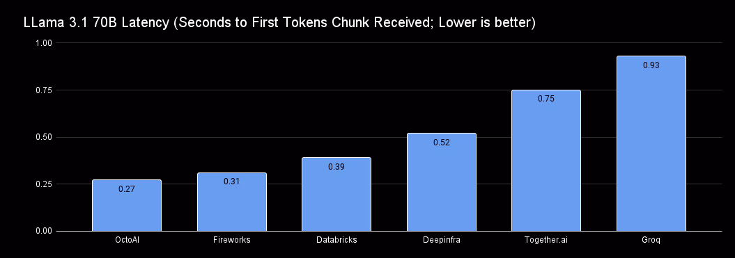 GPT-4o mini has a latency of 0.56 seconds, Claude 3.5 Haiku is at 0.52 seconds, and Gemini 1.5 Flash is at 1.05 seconds. With Llama 3.1 70b, you have at least four providers to choose from that can match or even offer lower latency than equivalent proprietary models.