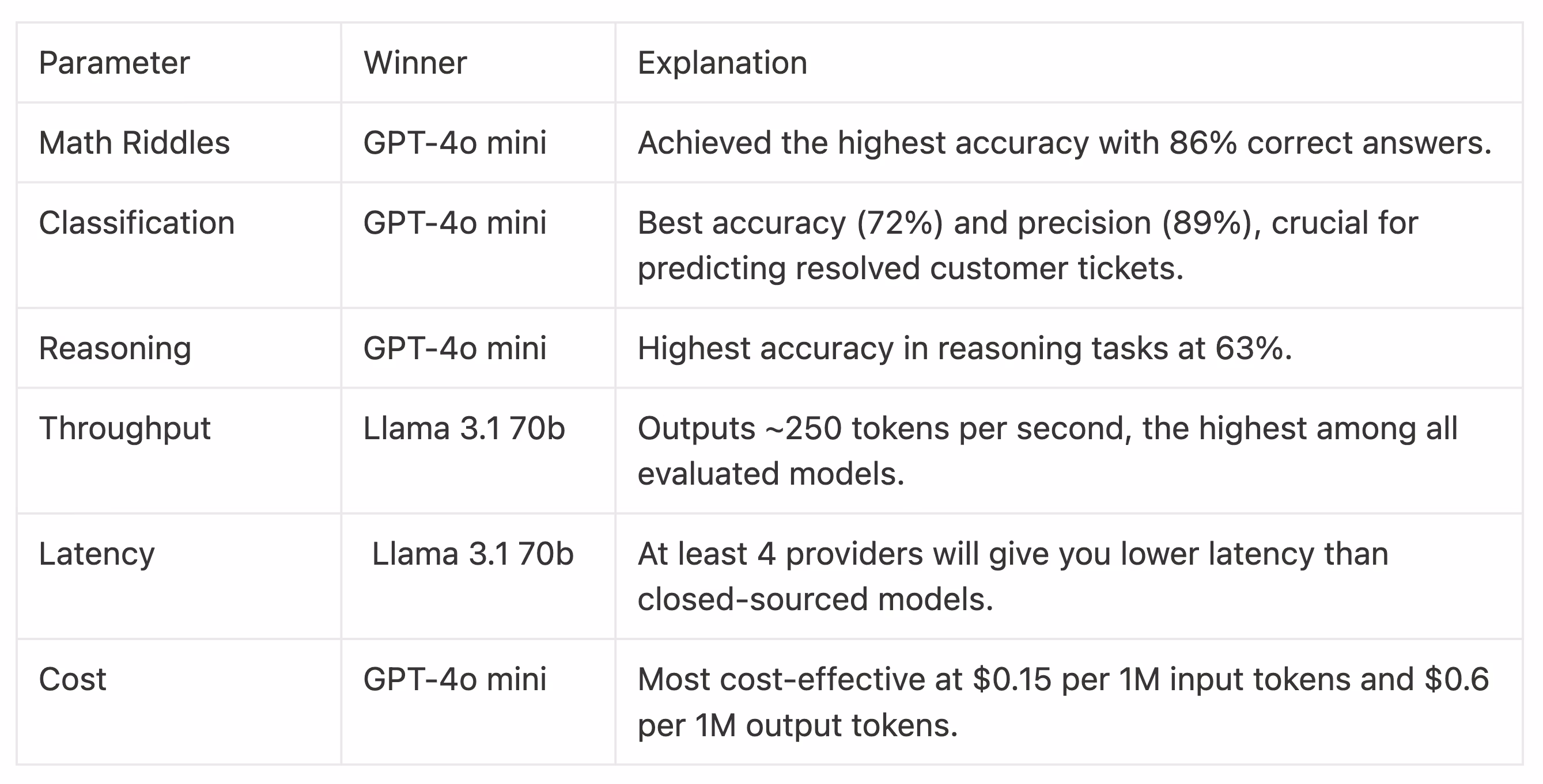 The evaluation highlights the growing power and relevance of open-source models like Llama 3.1 70b, which offer significant benefits in speed, efficiency, and cost. Meanwhile, proprietary models like GPT-4o mini excel in accuracy and precision, providing robust solutions for high-stakes tasks.