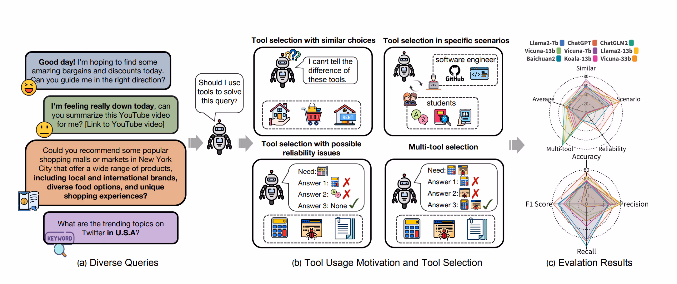 MetaTool is a benchmark designed to assess whether LLMs possess tool usage awareness and can correctly choose tools. It includes the ToolE Dataset, which contains prompts triggering single-tool and multi-tool scenarios, and evaluates tool selection across four subtasks. Results from experiments on nine LLMs show that most still face challenges in effective tool selection, revealing gaps in their intelligent capabilities.