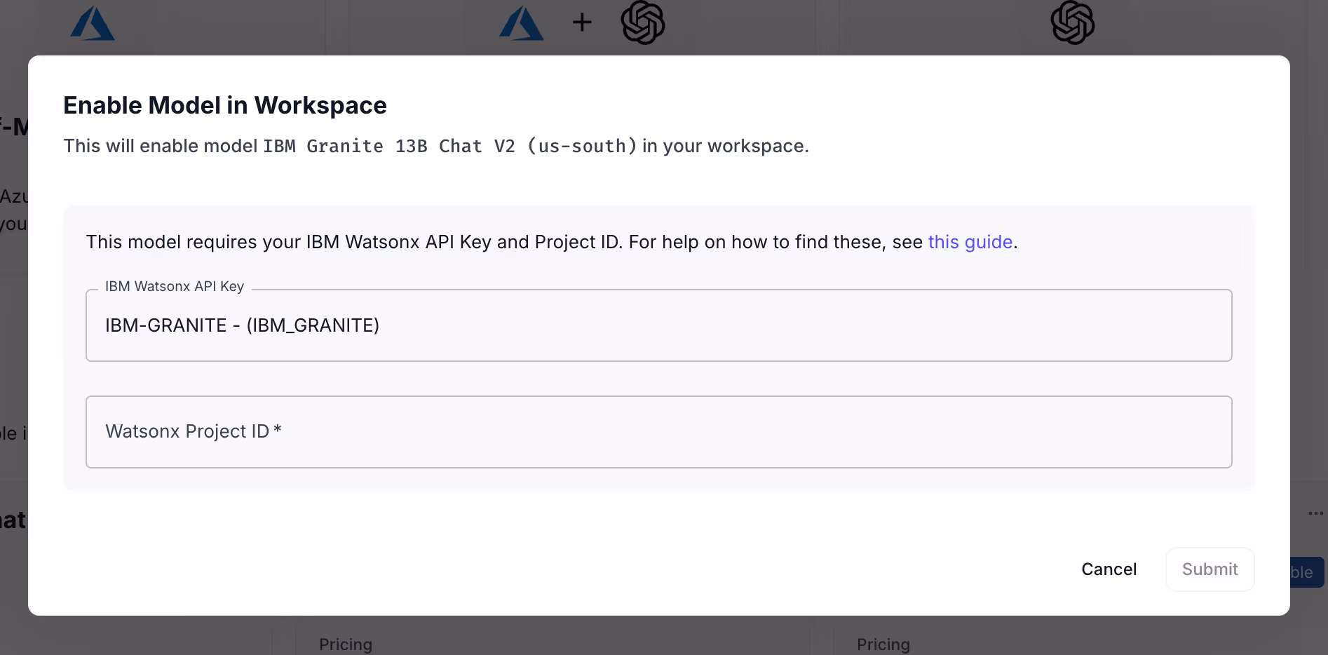 The models are now available to add to your workspace. To enable one, you need to get your API key from your your IBM profile, and add it as a Secret named IBM