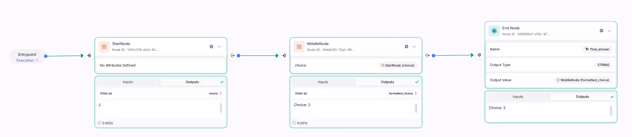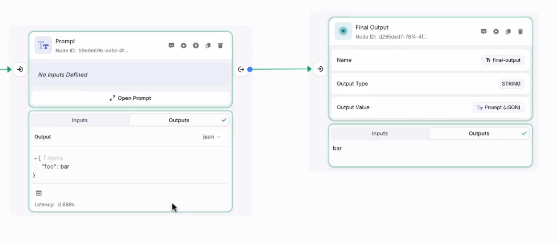 For example, you can use the accessor operator to reference an attribute in a json output from a Prompt Node by using this expression input: Output Value = Prompt[JSON].foo