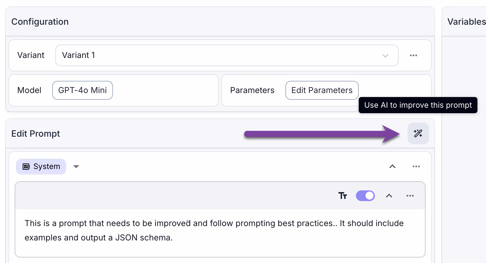 Now, you can use this feature to generate improved versions of your prompt directly from the Prompt Sandbox. This feature uses Anthropic under the hood and generates new prompts based on best practices. This feature is in beta and we would love to hear more feedback on how we can improve it!