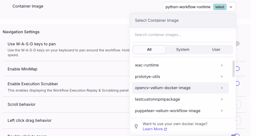 Workflows that are SDK enabled can now be run in a Docker Image of your choice! By default, all Workflows run in our base image, vellumai/python-workflow-runtime:latest. You can now extend that base image to define a new Docker image, push it up to Vellum, then associate it with your Workflow: