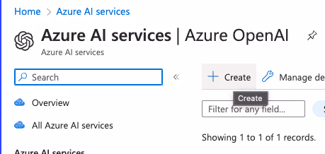 Once you are on the Azure OpenAI page, click the “Create” button on the top left of the dashboard. This is a Azure resource that could host multiple different OpenAI models.