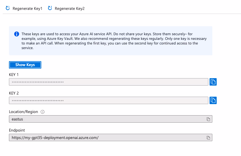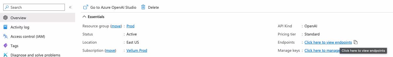 Copy the endpoint URL and Key 1 and enter both of those values below. You again need both to reference in your code, or when adding the model to Vellum.