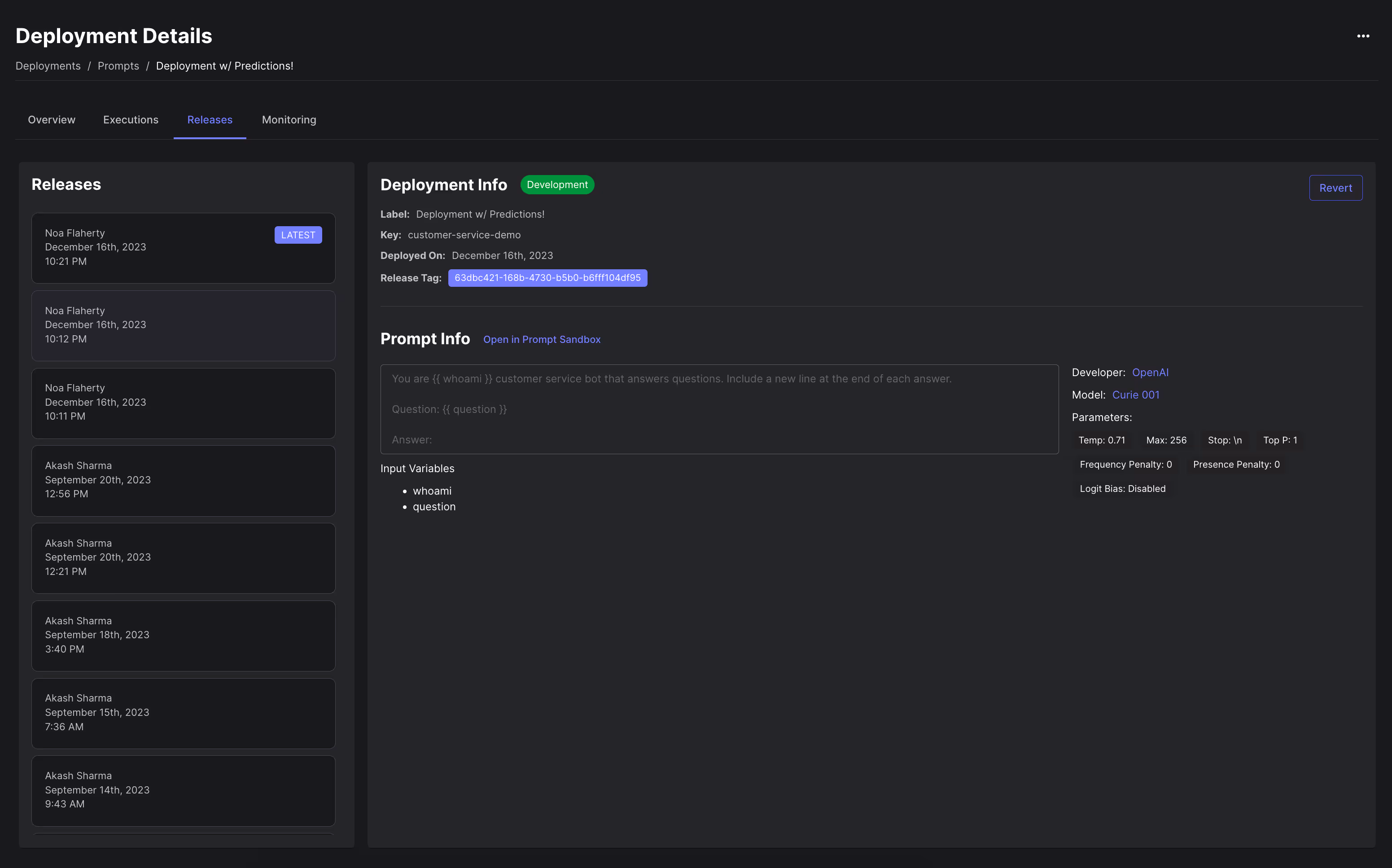To further improve the process of releasing new versions of Prompts/Workflows, we also now display a warning if you’re about to change the input/output interface of the deployment that’s being updated.