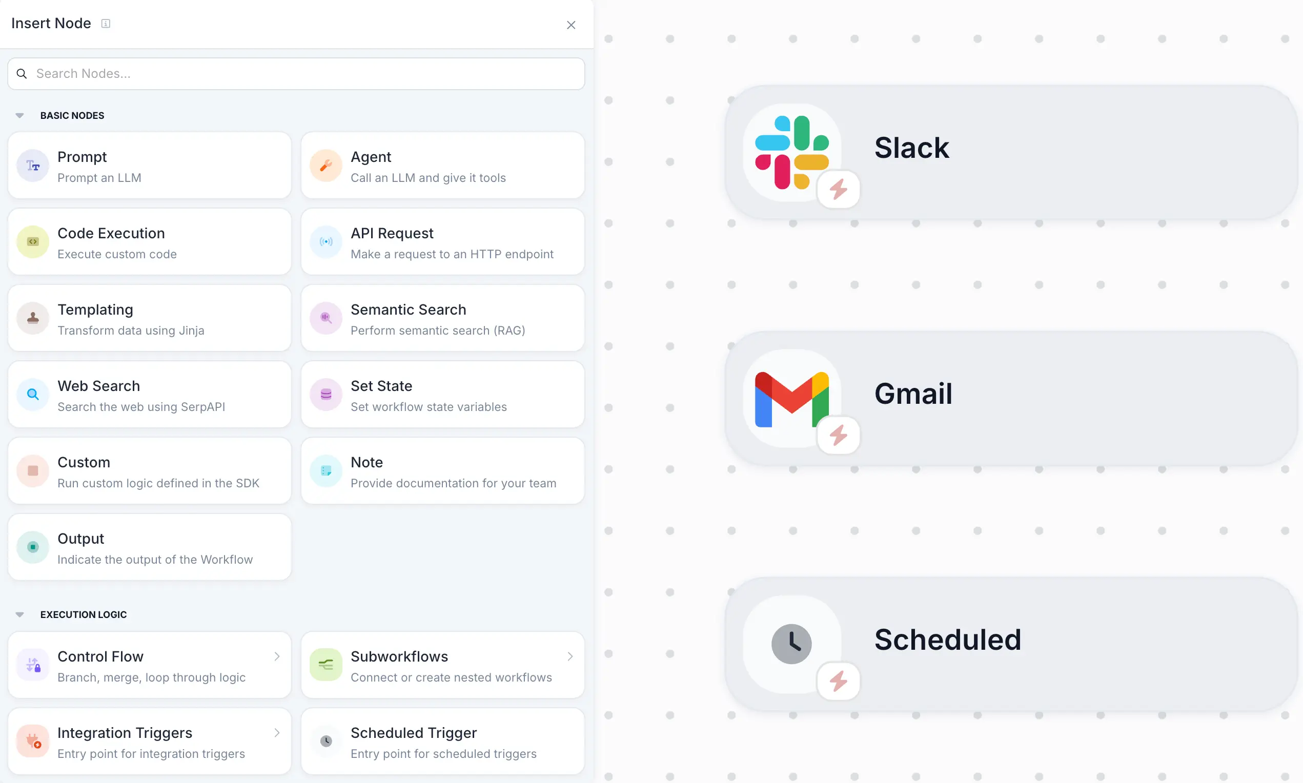 Use Agent Builder to connect these integrations on the fly and it’ll do all the heavy lifting of adding them to Agent Nodes and building Custom Nodes so you don’t have to.