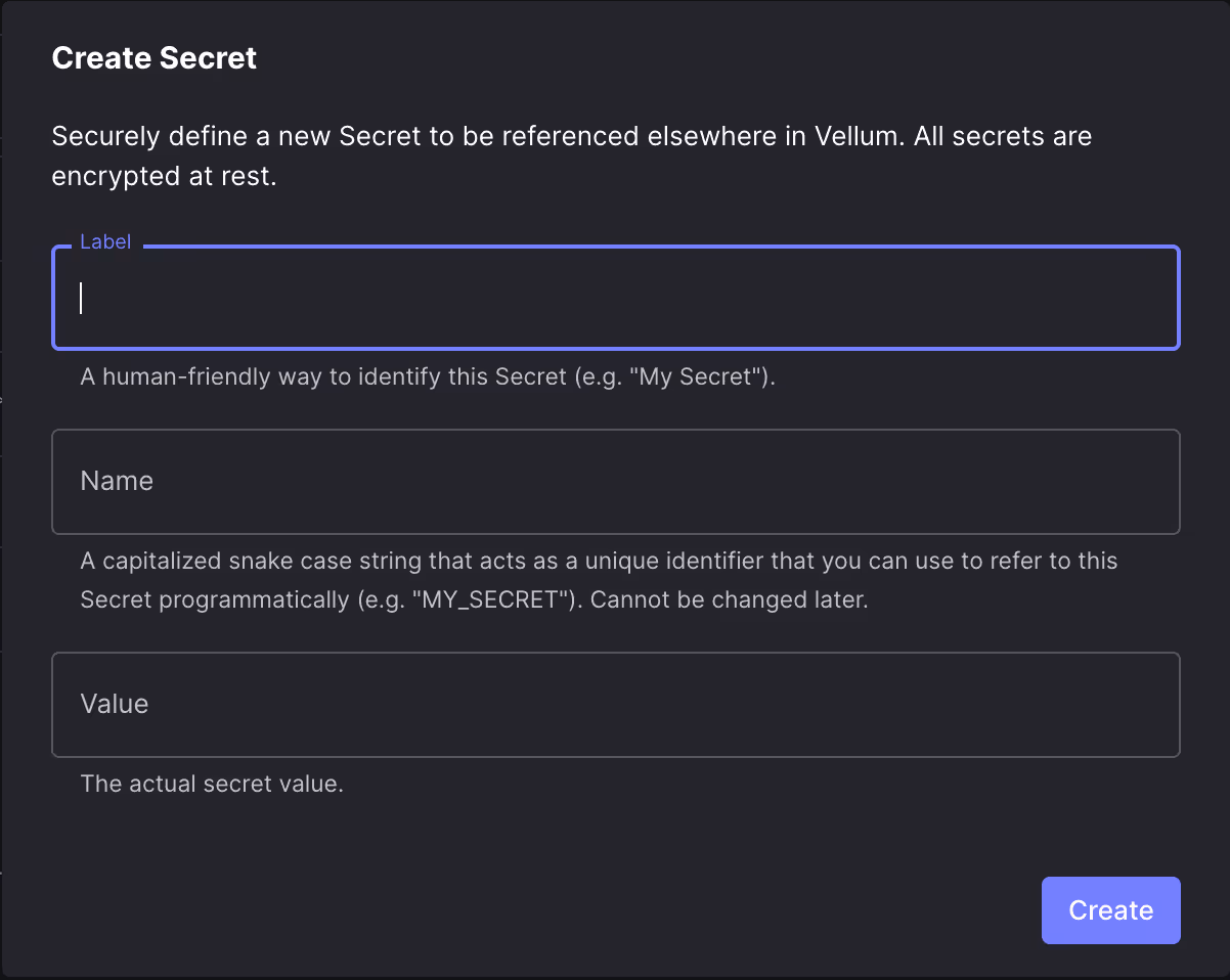 You can now define “Secrets” in one central place in Vellum (e.g. API keys, service tokens, etc.) and then dynamically reference them elsewhere in Vellum. These secret values are securely encrypted and stored using Google Cloud Platform’s KMS service.