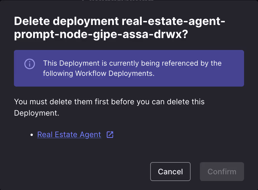 Every Prompt Node within a Workflow Deployment is backed by a Prompt Deployment. We now show a warning when you try to delete a Prompt Deployment that’s still in use by a Workflow Deployment.