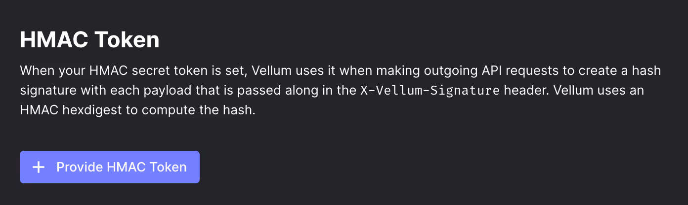 You can now provide a secret token that can be used to verify that outgoing API requests are in fact coming from Vellum. This is especially helpful if you’re standing up endpoints for use by API Nodes or Webhook Evaluation Metrics and want to ensure no one is trying to maliciously impersonate Vellum.