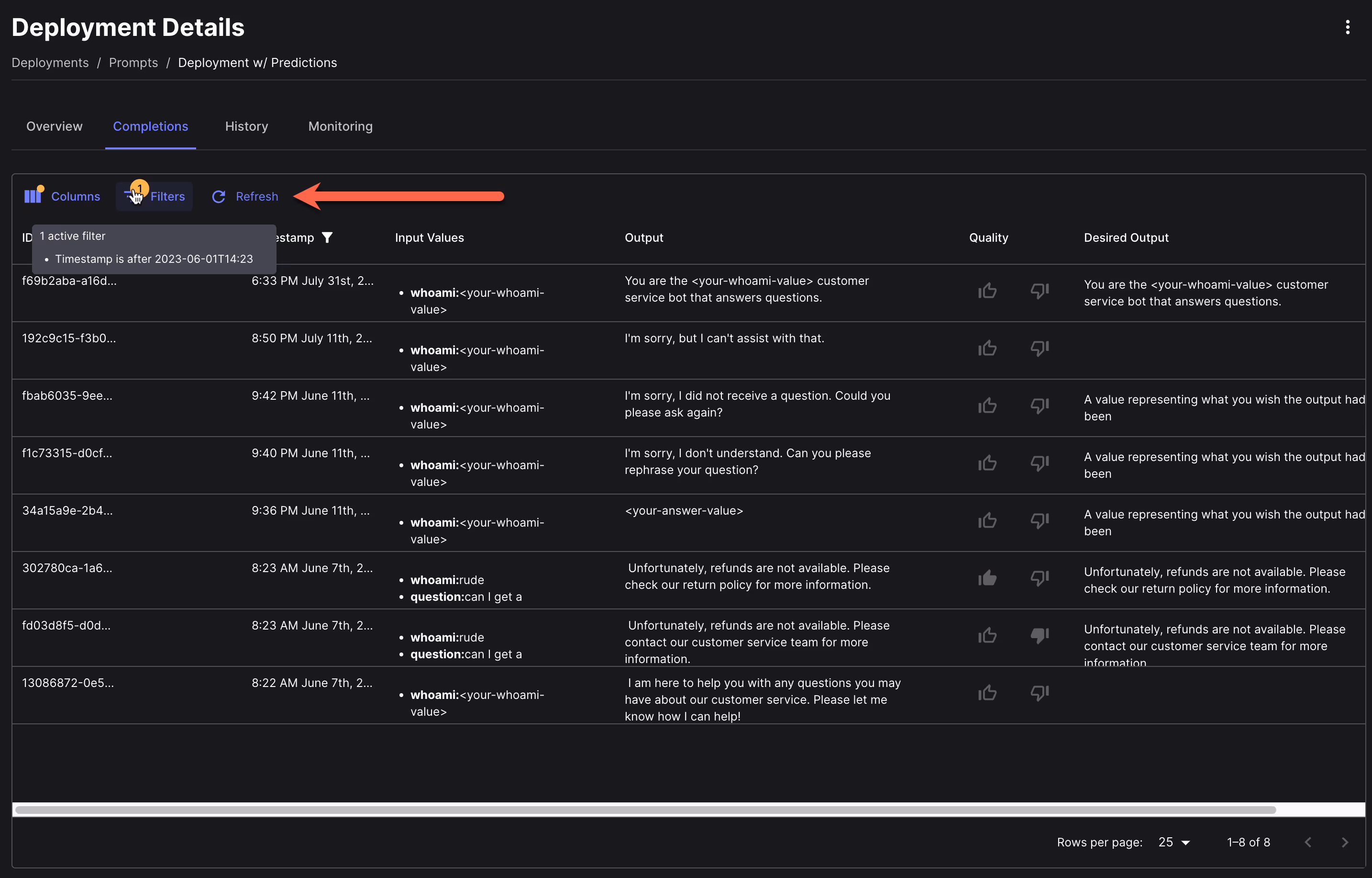 There are now visual indicators when the Completions table of a Prompt Deployment has hidden columns and/or has filters applied. As a result, it’s also easy to update column visibility and filter criteria. You can also now refresh the table’s data with the new “Refresh” button.