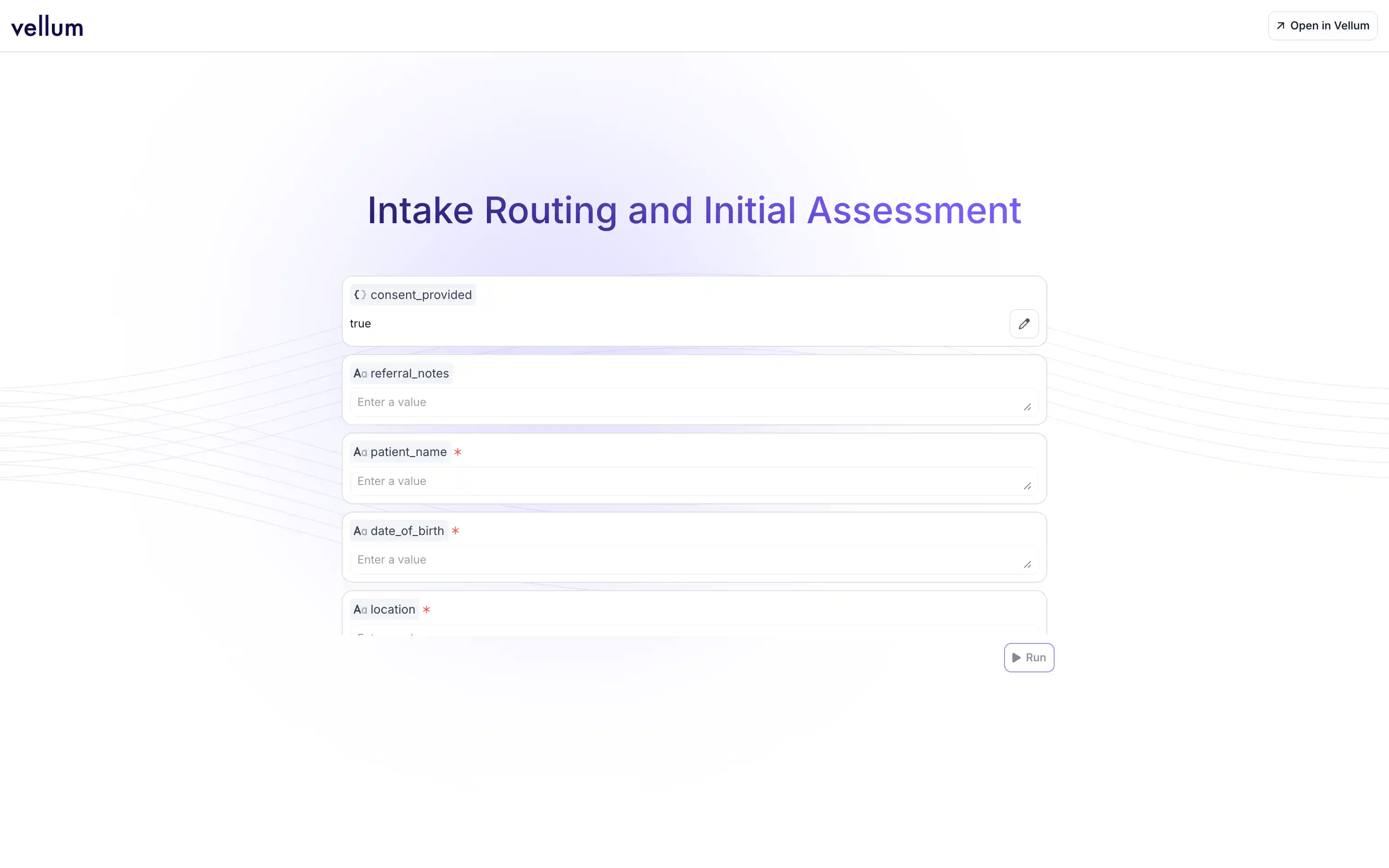 Vellum analyzes your deployed Workflow to generate the AI App UI with the appropriate input fields for plug and play use.