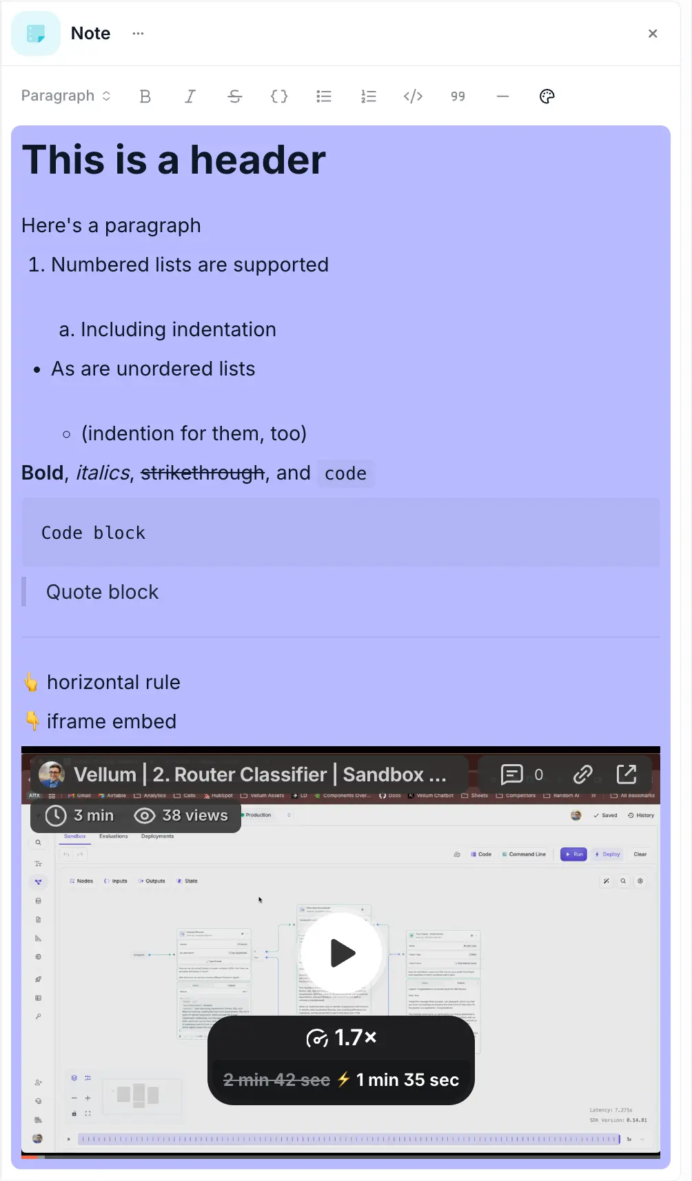 Note Nodes now fully support full markdown, including headers, code blocks, iframes, and more. Markdown enabled notes let you place context directly next to your workflow logic, to make documentation more practical and thorough.